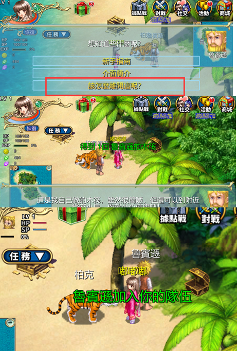 向【魯賓遜】詢問離開孤島的方法,對話結束後點擊【魯賓遜】身後的寶箱,就可以拿到道具木筏囉!並且【魯賓遜】會加入你的隊伍,成為你的夥伴一起冒險!