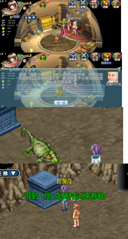 來到克蘭村找【克蘭村村長】,接取任務最初的試煉,擊敗大變色龍,拿走克蘭村試煉卷軸,回去跟【克蘭村村長】對話即可完成任務。