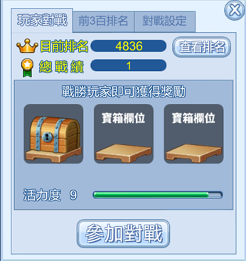 在遊戲界面右上角點擊【對戰】,與其他玩家進行對戰,對戰勝利即可獲得寶箱,勝利越多,寶箱獎勵越豐富!