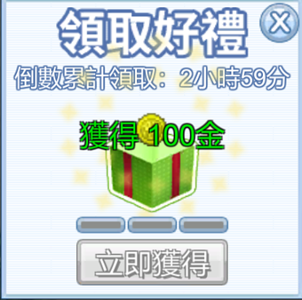 在遊戲界面上方點擊【綠色禮盒】,剩餘時間倒數完畢時,點擊立即獲得即可領取綠鑽、木人玩偶、補魔/補血包等豐富獎勵!